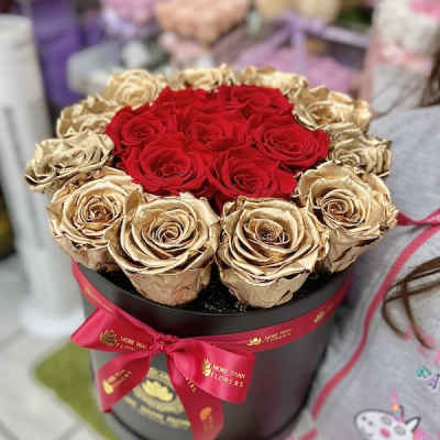 Price: $525.00 Magna Round Box Eternal Roses - White Box, Gold/White Roses Product Tags: Next-day Delivery